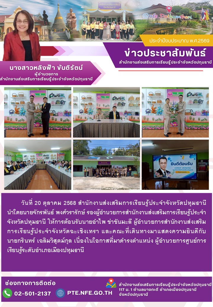วันที่ 20 ตุลาคม 2568 สำนักงานส่งเสริมการเรียนรู้ประจำจังหวัดปทุมธานี นำโดยนายจักรพันธ์ พงศ์วรารักษ์ รองผู้อำนวยการสำนักงานส่งเสริมการเรียนรู้ประจำจังหวัดปทุมธานี ให้การต้อนรับนายอำไพ ข่าขันมะลี ผู้อำนวยการสำนักงานส่งเสริมการเรียนรู้ประจำจังหวัดฉะเชิงเทรา และคณะที่เดินทางมาแสดงความยินดีกับ นายกรินทร์ เฉลิมวิสุตม์กุล เนื่องในโอกาสที่มาดำรงตำแหน่ง ผู้อำนวยการศูนย์การเรียนรู้ระดับอำเภอเมืองปทุมธานี