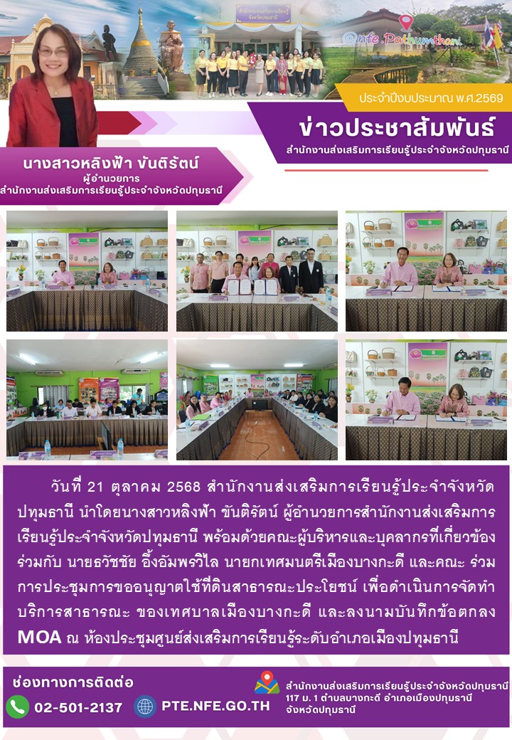 วันที่ 21 ตุลาคม 2568 สำนักงานส่งเสริมการเรียนรู้ประจำจังหวัดปทุมธานี นำโดยนางสาวหลิงฟ้า ขันติรัตน์ ผู้อำนวยการสำนักงานส่งเสริมการเรียนรู้ประจำจังหวัดปทุมธานี พร้อมด้วยคณะผู้บริหารและบุคลากรที่เกี่ยวข้อง ร่วมกับ นายธวัชชัย อึ้งอัมพรวิไล นายกเทศมนตรีเมืองบางกะดี และคณะ ร่วมการประชุมการขออนุญาตใช้ที่ดินสาธารณะประโยชน์ เพื่อดำเนินการจัดทำบริการสาธารณะ ของเทศบาลเมืองบางกะดี และลงนามบันทึกข้อตกลง MOA ณ ห้องประชุมศูนย์ส่งเสริมการเรียนรู้ระดับอำเภอเมืองปทุมธานี