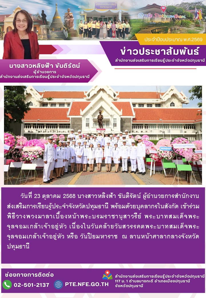 วันที่ 23 ตุลาคม 2568 นางสาวหลิงฟ้า ขันติรัตน์ผู้อํานวยการสํานักงานส่งเสริมการเรียนรู้ประจําจังหวัดปทุมธานี พร้อมด้วยบุคลากรในสังกัด เข้าร่วมพิธีวางพวงมาลาเบื้องหน้าพระบรมราชานุสาวรีย์ พระบาทสมเด็จพระจุลจอมเกล้าเจ้าอยู่หัว เนื่องในวันคล้ายวันสวรรคตพระบาทสมเด็จพระจุลจอมเกล้าเจ้าอยู่หัว หรือ วันปิยมหาราช ณ ลานหน้าศาลากลางจังหวัดปทุมธานี