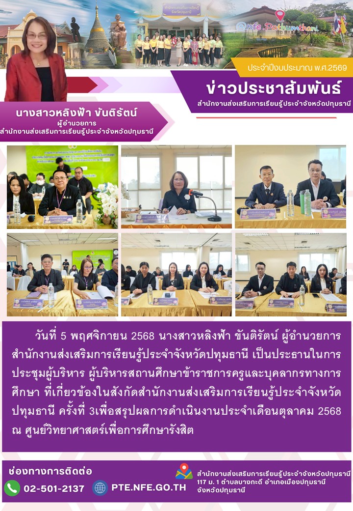 5 พฤศจิกายน 2568 การประชุมผู้บริหาร ผู้บริหารสถานศึกษาข้าราชการครูและบุคลากรทางการศึกษา ที่เกี่ยวข้องในสังกัดสำนักงานส่งเสริมการเรียนรู้ประจำจังหวัดปทุมธานี ครั้งที่ 3