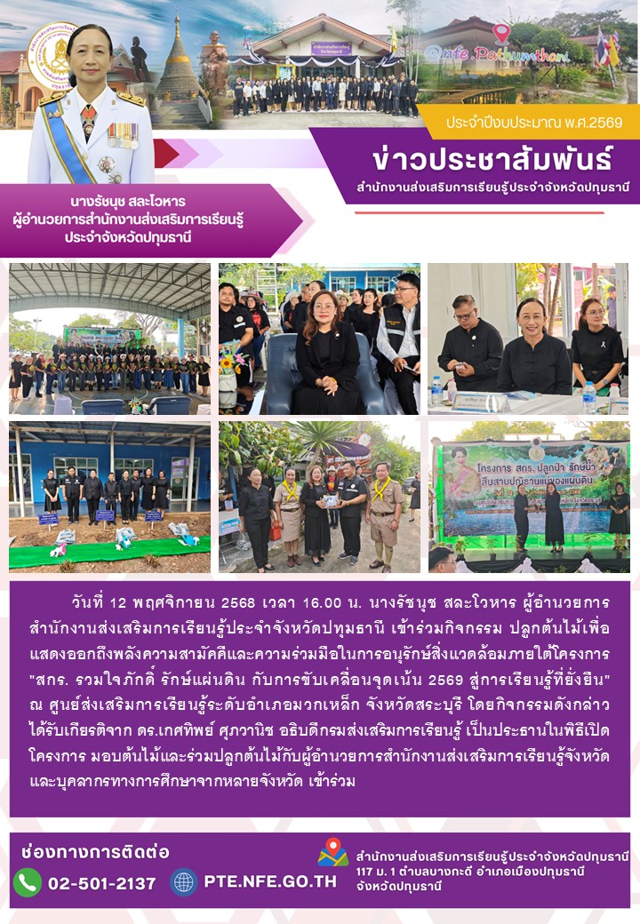 วันที่ 12 พฤศจิกายน 2568 เวลา 16.00 น. นางรัชนุช สละโวหาร ผู้อำนวยการสำนักงานส่งเสริมการเรียนรู้ประจำจังหวัดปทุมธานี เข้าร่วมกิจกรรม ปลูกต้นไม้เพื่อแสดงออกถึงพลังความสามัคคีและความร่วมมือในการอนุรักษ์สิ่งแวดล้อมภายใต้โครงการ "สกร. รวมใจภักดิ์ รักษ์แผ่นดิน กับการขับเคลื่อนจุดเน้น 2569 สู่การเรียนรู้ที่ยั่งยืน" ณ ศูนย์ส่งเสริมการเรียนรู้ระดับอำเภอมวกเหล็ก จังหวัดสระบุรี โดยกิจกรรมดังกล่าว ได้รับเกียรติจาก ดร.เกศทิพย์ ศุภวานิช อธิบดีกรมส่งเสริมการเรียนรู้ เป็นประธานในพิธีเปิดโครงการ มอบต้นไม้และร่วมปลูกต้นไม้กับผู้อำนวยการสำนักงานส่งเสริมการเรียนรู้จังหวัด และบุคลากรทางการศึกษาจากหลายจังหวัด เข้าร่วม