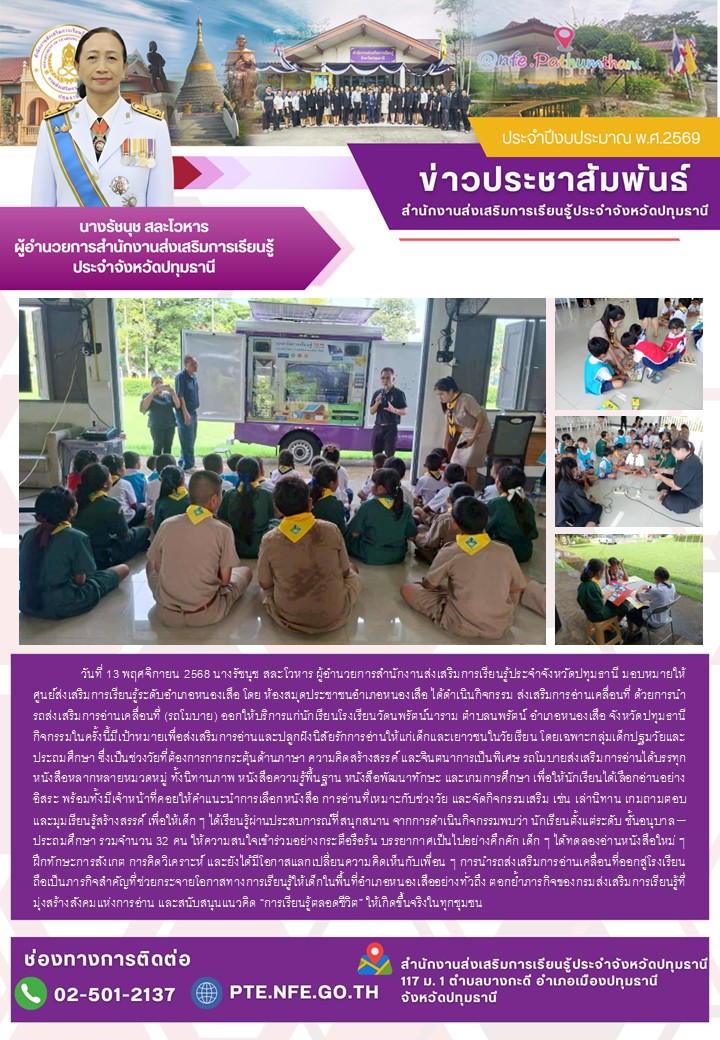 ศูนย์ส่งเสริมการเรียนรู้ระดับอำเภอหนองเสือ นำรถโมบายส่งเสริมการอ่านออกให้บริการนักเรียนโรงเรียนวัดนพรัตน์นาราม จ.ปทุมธานี วันที่ 13 พฤศจิกายน 2568 นางรัชนุช สละโวหาร ผู้อำนวยการสำนักงานส่งเสริมการเรียนรู้ประจำจังหวัดปทุมธานี มอบหมายให้ศูนย์ส่งเสริมการเรียนรู้ระดับอำเภอหนองเสือ โดย ห้องสมุดประชาชนอำเภอหนองเสือ ได้ดำเนินกิจกรรม ส่งเสริมการอ่านเคลื่อนที่ ด้วยการนำ รถส่งเสริมการอ่านเคลื่อนที่ (รถโมบาย) ออกให้บริการแก่นักเรียนโรงเรียนวัดนพรัตน์นาราม ตำบลนพรัตน์ อำเภอหนองเสือ จังหวัดปทุมธานี กิจกรรมในครั้งนี้มีเป้าหมายเพื่อส่งเสริมการอ่านและปลูกฝังนิสัยรักการอ่านให้แก่เด็กและเยาวชนในวัยเรียน โดยเฉพาะกลุ่มเด็กปฐมวัยและประถมศึกษา ซึ่งเป็นช่วงวัยที่ต้องการการกระตุ้นด้านภาษา ความคิดสร้างสรรค์ และจินตนาการเป็นพิเศษ รถโมบายส่งเสริมการอ่านได้บรรทุกหนังสือหลากหลายหมวดหมู่ ทั้งนิทานภาพ หนังสือความรู้พื้นฐาน หนังสือพัฒนาทักษะ และเกมการศึกษา เพื่อให้นักเรียนได้เลือกอ่านอย่างอิสระ พร้อมทั้งมีเจ้าหน้าที่คอยให้คำแนะนำการเลือกหนังสือ การอ่านที่เหมาะกับช่วงวัย และจัดกิจกรรมเสริม เช่น เล่านิทาน เกมถามตอบ และมุมเรียนรู้สร้างสรรค์ เพื่อให้เด็ก ๆ ได้เรียนรู้ผ่านประสบการณ์ที่สนุกสนาน จากการดำเนินกิจกรรมพบว่า นักเรียนตั้งแต่ระดับ ชั้นอนุบาล – ประถมศึกษา รวมจำนวน 32 คน ให้ความสนใจเข้าร่วมอย่างกระตือรือร้น บรรยากาศเป็นไปอย่างคึกคัก เด็ก ๆ ได้ทดลองอ่านหนังสือใหม่ ๆ ฝึกทักษะการสังเกต การคิดวิเคราะห์ และยังได้มีโอกาสแลกเปลี่ยนความคิดเห็นกับเพื่อน ๆ การนำรถส่งเสริมการอ่านเคลื่อนที่ออกสู่โรงเรียน ถือเป็นภารกิจสำคัญที่ช่วยกระจายโอกาสทางการเรียนรู้ให้เด็กในพื้นที่อำเภอหนองเสืออย่างทั่วถึง ตอกย้ำภารกิจของกรมส่งเสริมการเรียนรู้ที่มุ่งสร้างสังคมแห่งการอ่าน และสนับสนุนแนวคิด “การเรียนรู้ตลอดชีวิต” ให้เกิดขึ้นจริงในทุกชุมชน